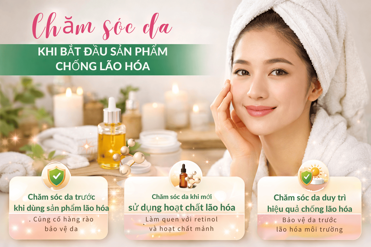 Vì vậy, việc xây dựng một quy trình chăm sóc da khoa học ngay từ đầu sẽ giúp làn da thích nghi tốt với các sản phẩm chống lão hóa. Khi được chăm sóc đúng cách, các hoạt chất này không chỉ giúp giảm nếp nhăn mà còn hỗ trợ cải thiện độ đàn hồi, tăng cường độ sáng và giúp da duy trì vẻ tươi trẻ lâu dài.