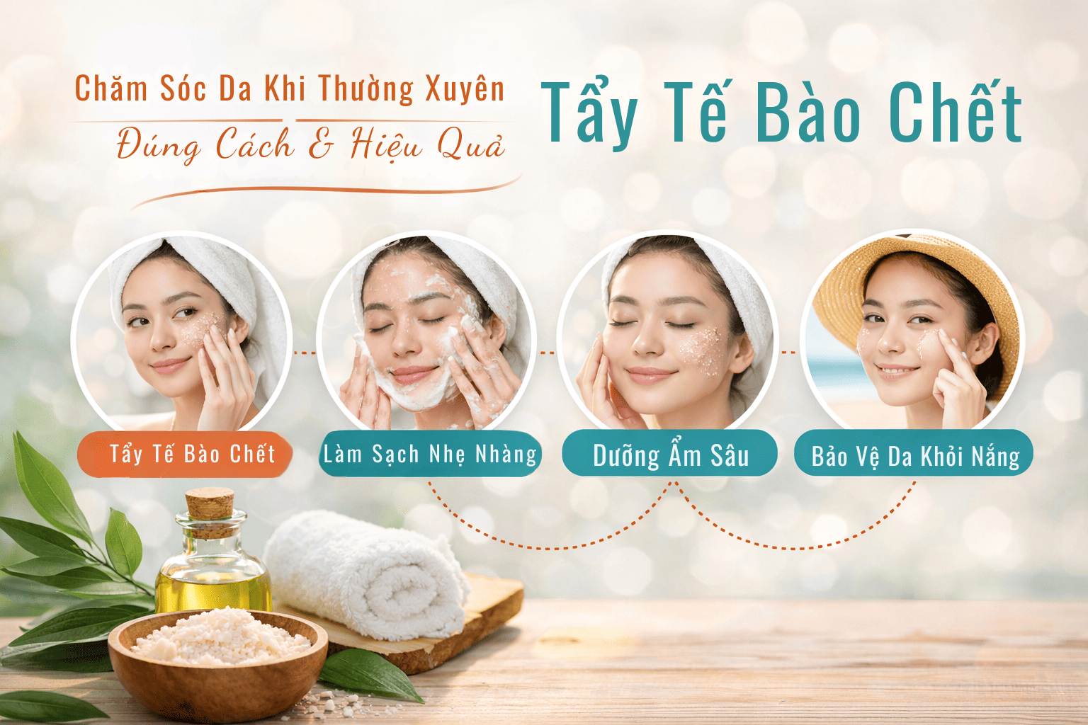 Tẩy tế bào chết là một bước quan trọng trong quy trình chăm sóc da. Khi được thực hiện đúng cách, bước này giúp loại bỏ lớp sừng già cỗi, hỗ trợ tái tạo làn da mới và tăng khả năng hấp thụ dưỡng chất. Tuy nhiên, việc thường xuyên tẩy tế bào chết mà không biết cách chăm sóc phù hợp có thể khiến da trở nên nhạy cảm, dễ kích ứng hoặc mất cân bằng độ ẩm.