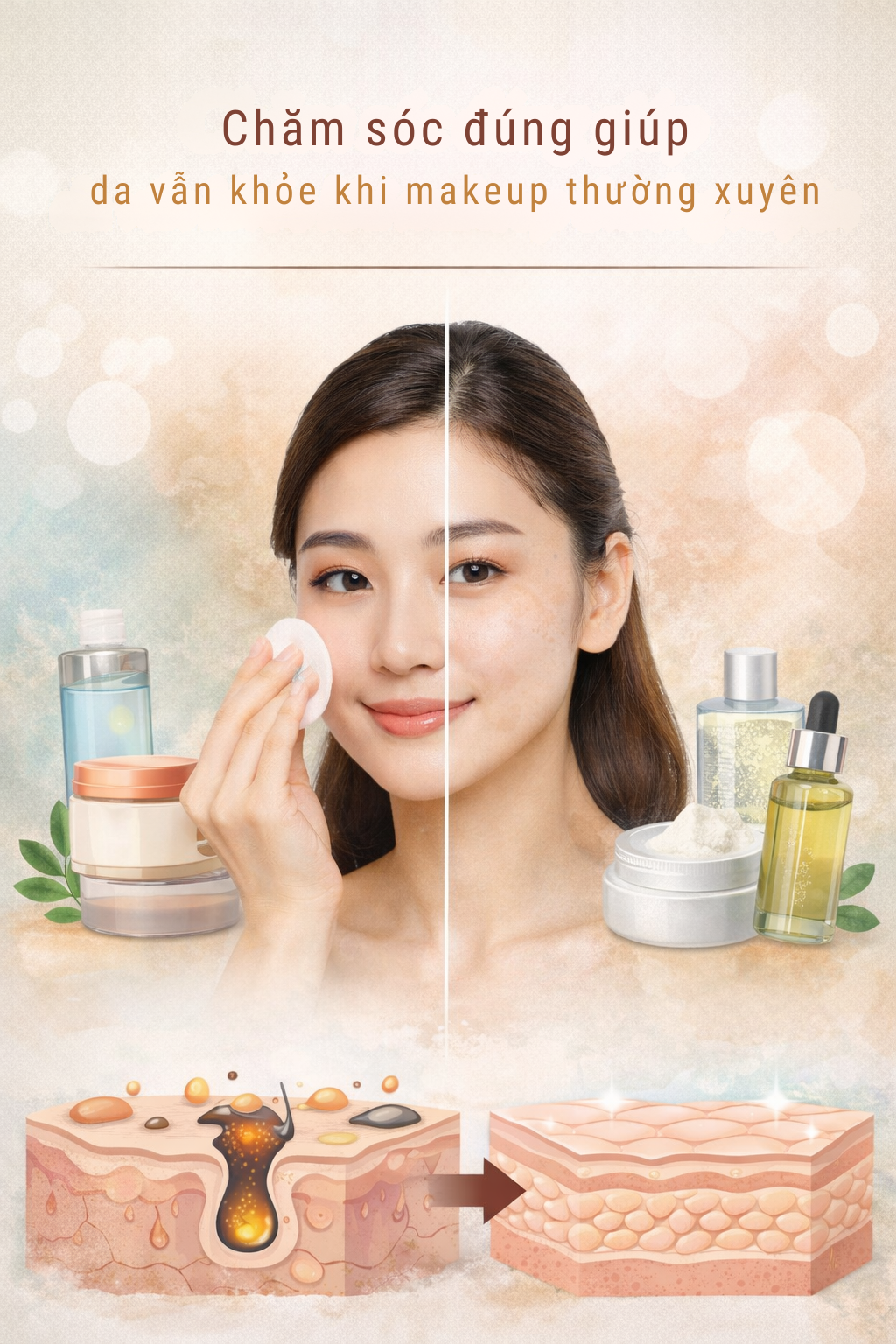 Trang điểm mỗi ngày không phải là nguyên nhân khiến da xấu đi. Vấn đề nằm ở việc bạn có thực hiện Chăm sóc da sau khi trang điểm thường xuyên đúng cách hay không. Lớp nền, kem chống nước và bụi mịn tích tụ nhiều giờ trên bề mặt da tạo áp lực đáng kể lên lỗ chân lông và hàng rào bảo vệ tự nhiên. Nếu không được làm sạch và phục hồi đúng quy trình, da rất dễ nổi mụn, xỉn màu và nhanh lão hóa.