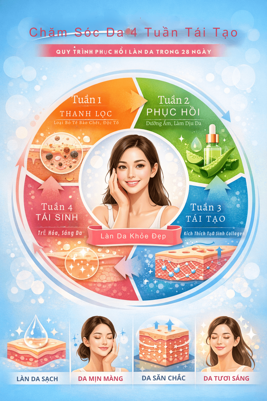 Phương pháp chăm sóc da theo mô hình 4 tuần tái tạo chia quy trình chăm sóc thành từng giai đoạn tương ứng với quá trình sinh học của da. Mỗi giai đoạn tập trung vào một mục tiêu riêng, từ làm sạch sâu đến phục hồi và duy trì hàng rào bảo vệ da.